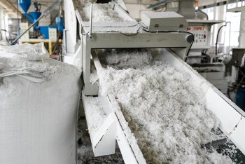 Материал измельчают способом дробления. В результате получаются частички, размер которых составляет 0,25-0,95 см. При необходимости получить частички меньшего размера, используется новое оборудование. Современные технологии позволяют измельчить материал до размеров 0,6-0,19 см.